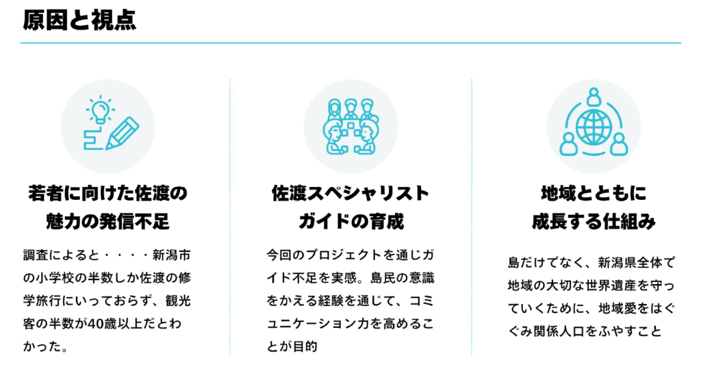 最終的なアイデアは様々ですが、そのグループも出発点は「世界遺産「佐渡島の金山」を持続可能な形で未来につなげていくために」という目標に向けたものでした。